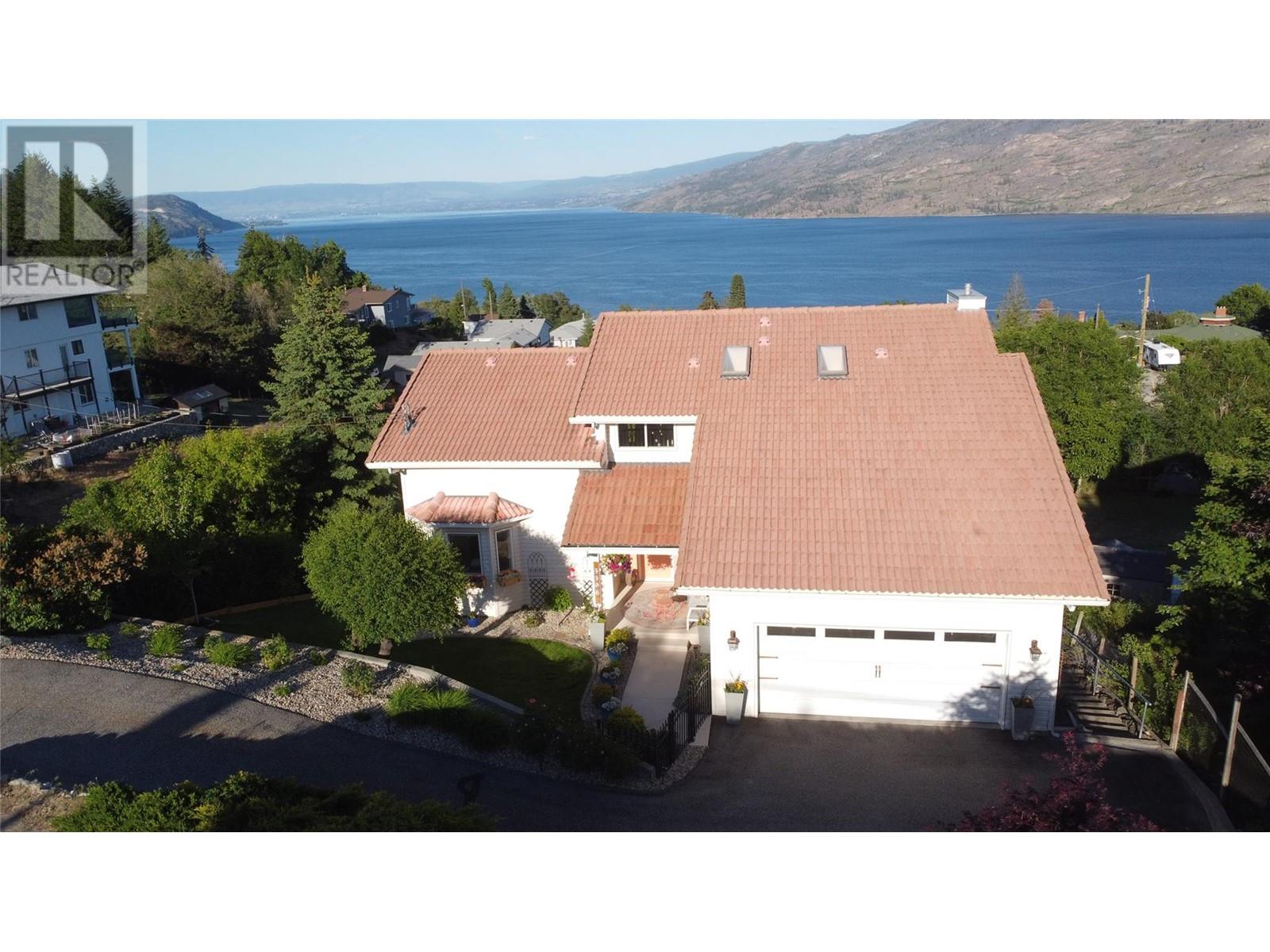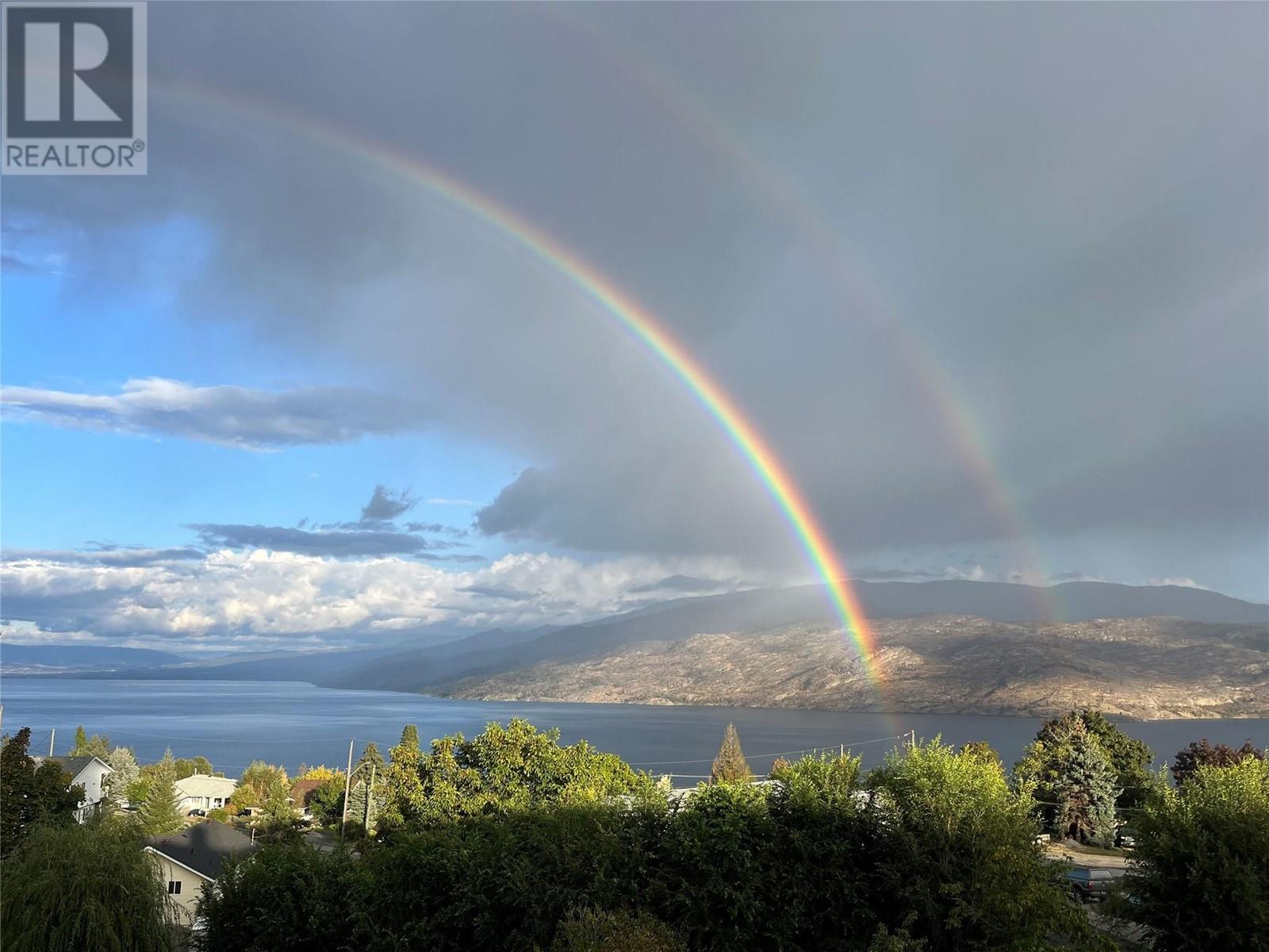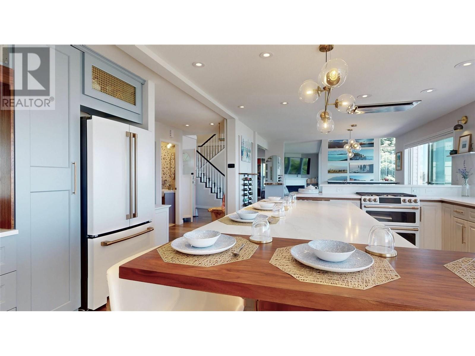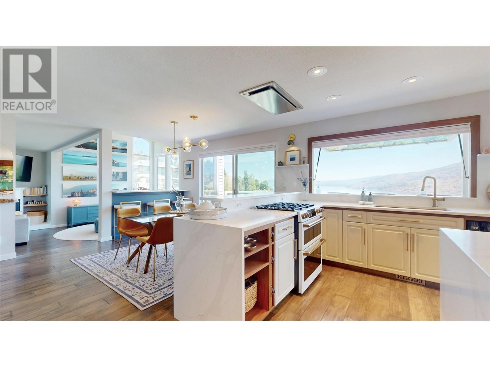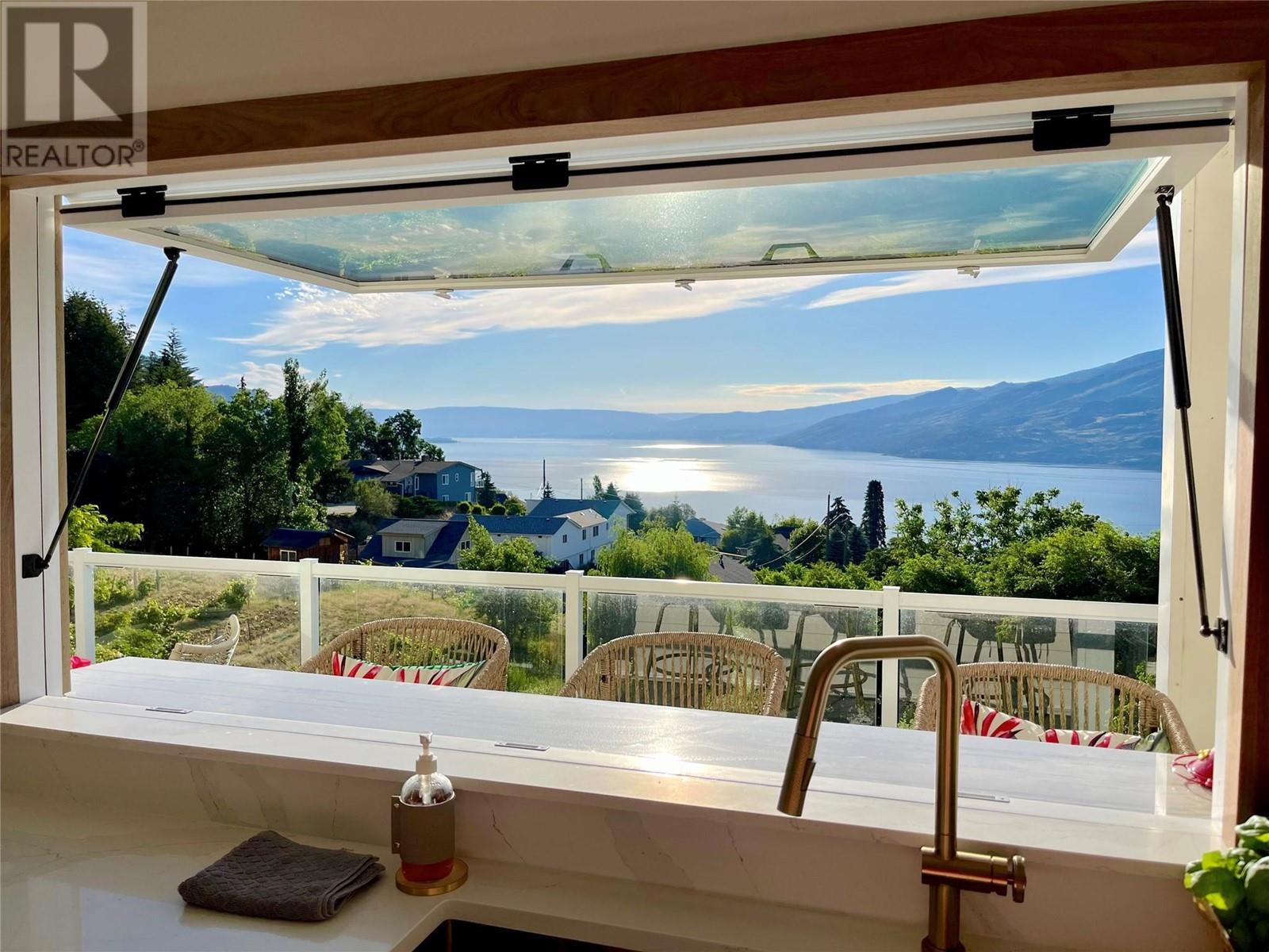 The moment you walk through the front door you are greeted with expansive sight lines to the lake across the entire width of the main floor. Huge vaulted ceilings to your left to the upstairs and very tall great room windows open up the lake and valley views to raise your spirits. To your right is a large designer island kitchen that opens up a world of possibilities for entertaining. Enjoy 6 burner gas stove with Euro style hood vent, a coffee & wine bar, open shelving, window trim & island in custom black walnut. The large picture window opens all the way for access to the kitchen bar on sundeck. Enjoy the outdoor quartzite eating bar. The upper level boasts a large primary bedroom with terrific views looking across and south to Penticton. A 5-piece ensuite with large soaker and walk in shower plus walk-in closet compliment the primary bedroom. The lower level offers a large family room/rec room with access to a massive stamped concrete deck with lovely lake and garden views. Enjoy double garage with room to turn around at the bottom, plus extra parking along the road. Ellison Ave is a school bus route which gets plowed first in the winter. There is a bus stop just up the street at Ellison & Princeton Road. New lighting throughout, top down bottom up blinds for maximum view and privacy, French bistro brass & glass shelving. New hot water tank. Furnace 2015, AC Compressor 2022 and newer appliances. Clay tile roof! Just move in! (id:2469)