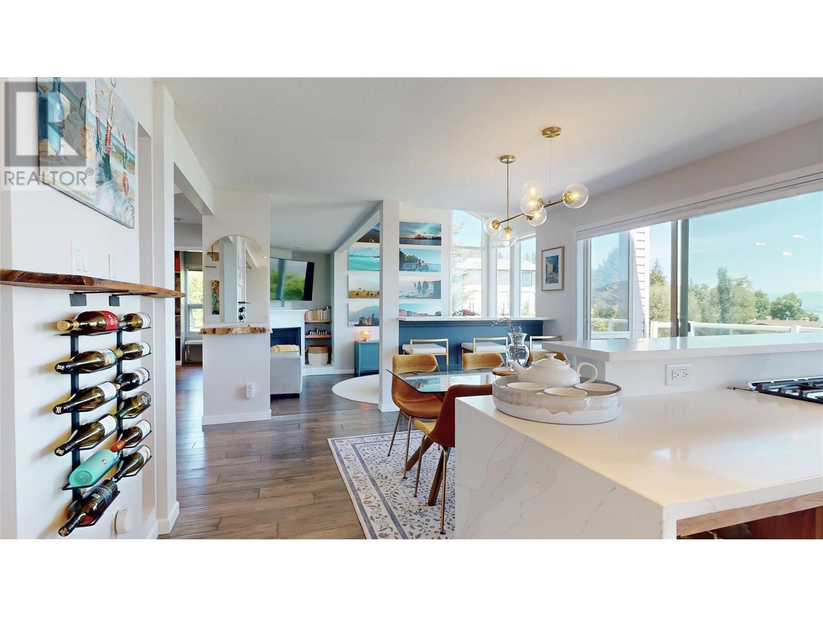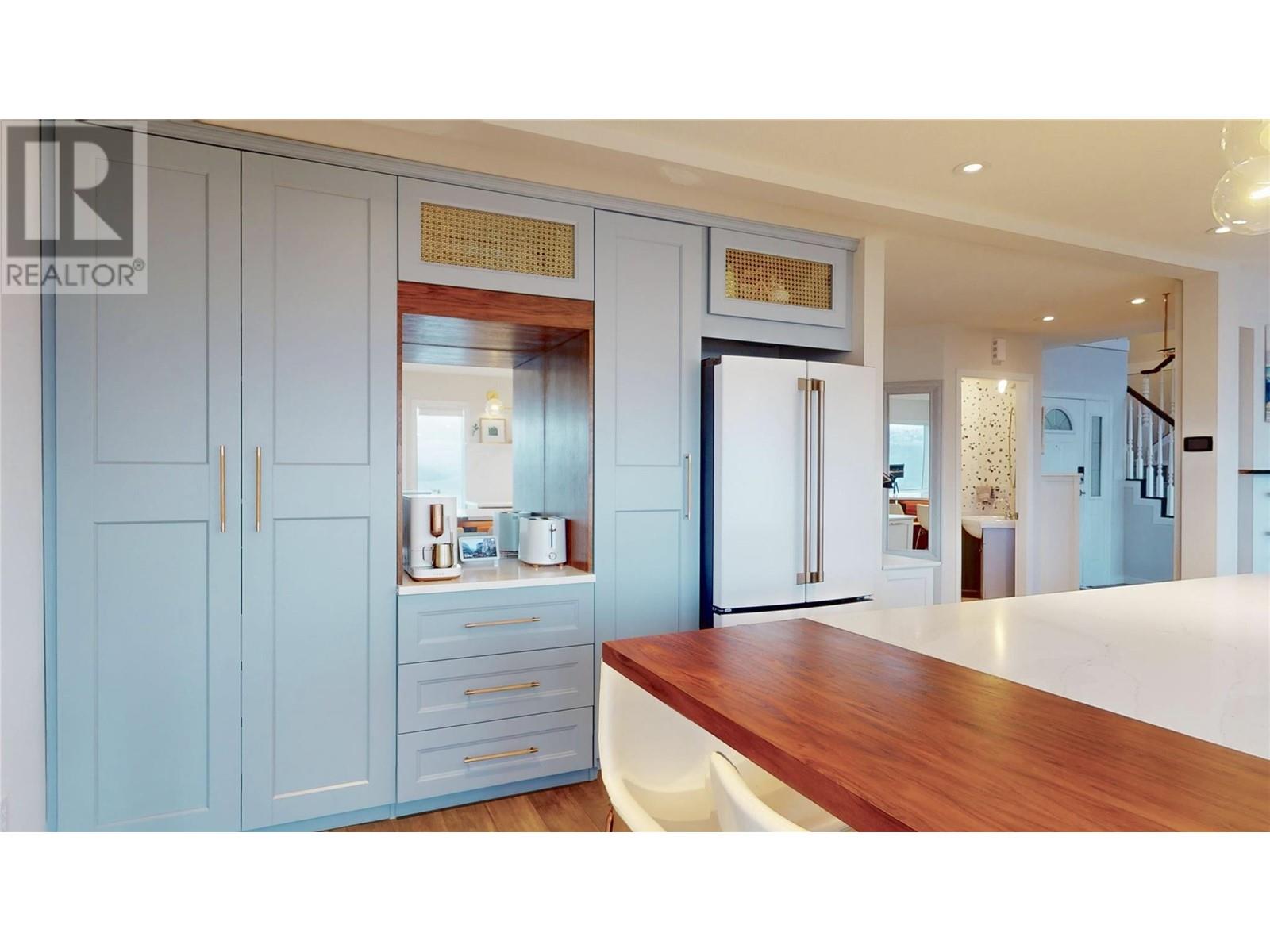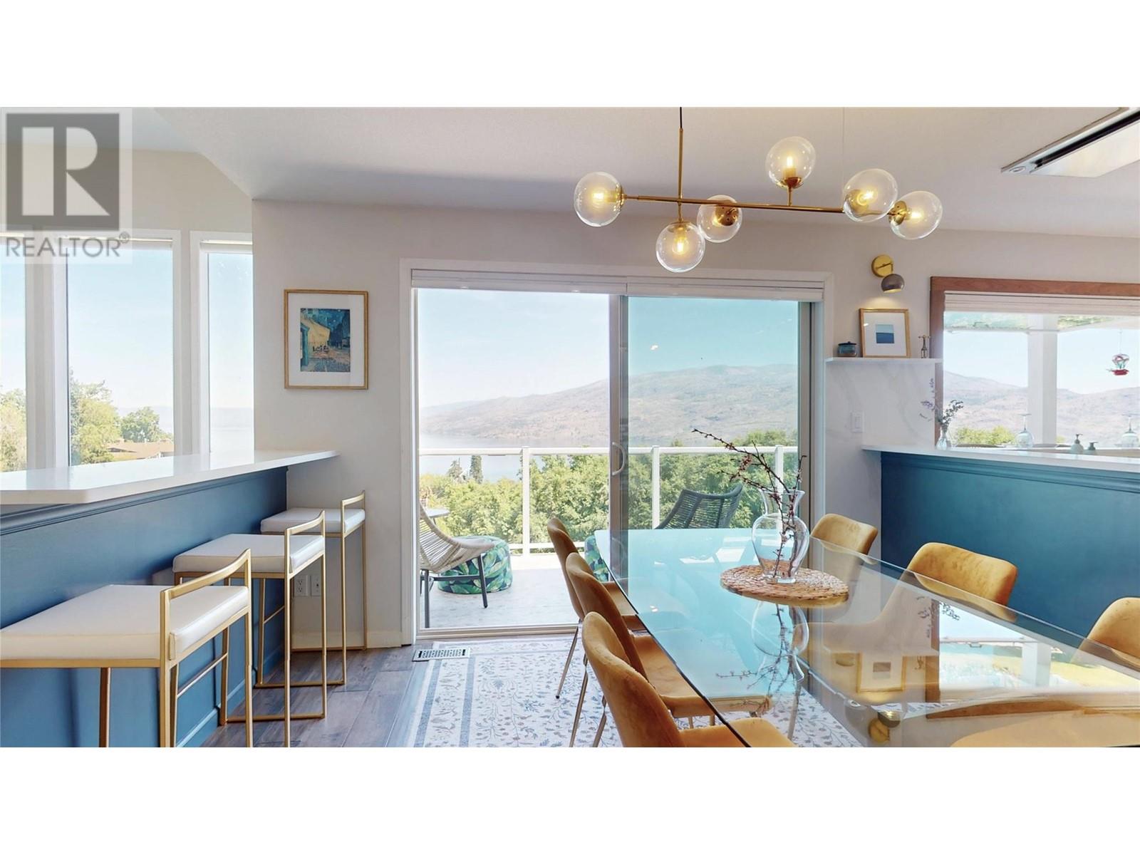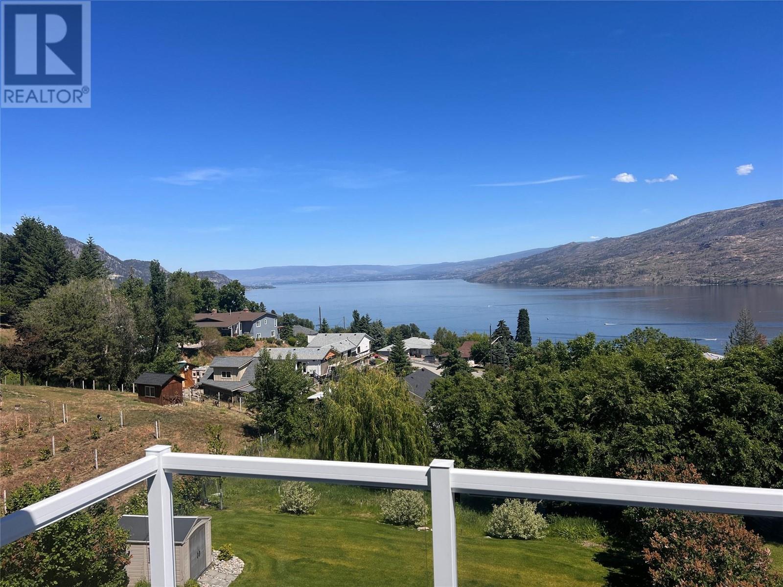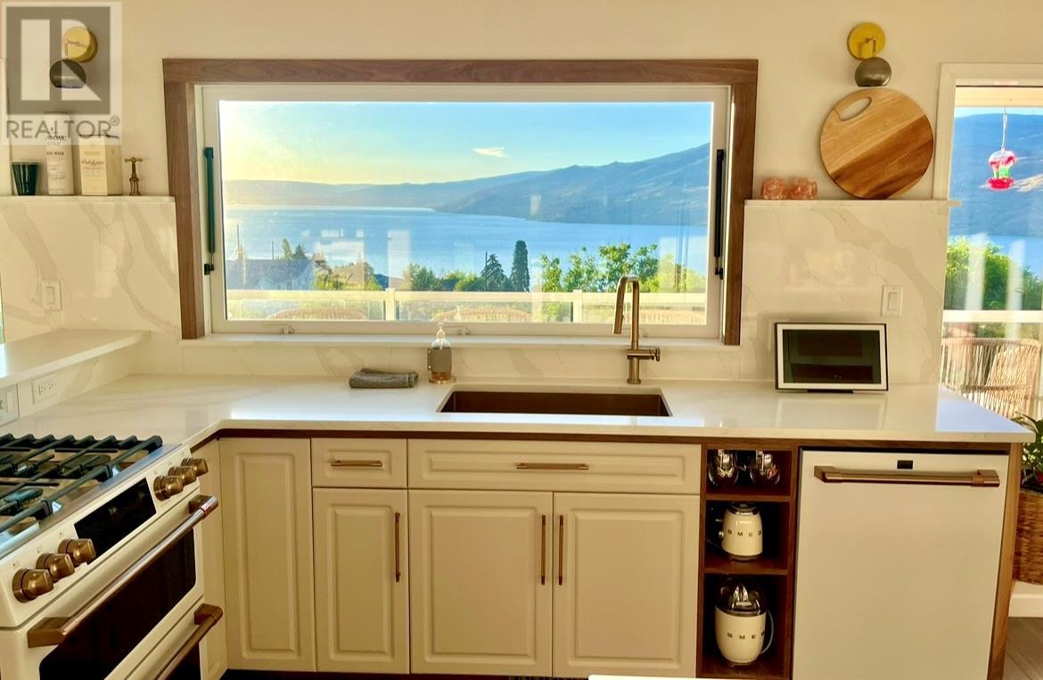 The moment you walk through the front door you are greeted with expansive sight lines to the lake across the entire width of the main floor. Huge vaulted ceilings to your left to the upstairs and very tall great room windows open up the lake and valley views to raise your spirits. To your right is a large designer island kitchen that opens up a world of possibilities for entertaining. Enjoy 6 burner gas stove with Euro style hood vent, a coffee & wine bar, open shelving, window trim & island in custom black walnut. The large picture window opens all the way for access to the kitchen bar on sundeck. Enjoy the outdoor quartzite eating bar. The upper level boasts a large primary bedroom with terrific views looking across and south to Penticton. A 5-piece ensuite with large soaker and walk in shower plus walk-in closet compliment the primary bedroom. The lower level offers a large family room/rec room with access to a massive stamped concrete deck with lovely lake and garden views. Enjoy double garage with room to turn around at the bottom, plus extra parking along the road. Ellison Ave is a school bus route which gets plowed first in the winter. There is a bus stop just up the street at Ellison & Princeton Road. New lighting throughout, top down bottom up blinds for maximum view and privacy, French bistro brass & glass shelving. New hot water tank. Furnace 2015, AC Compressor 2022 and newer appliances. Clay tile roof! Just move in! (id:2469)
