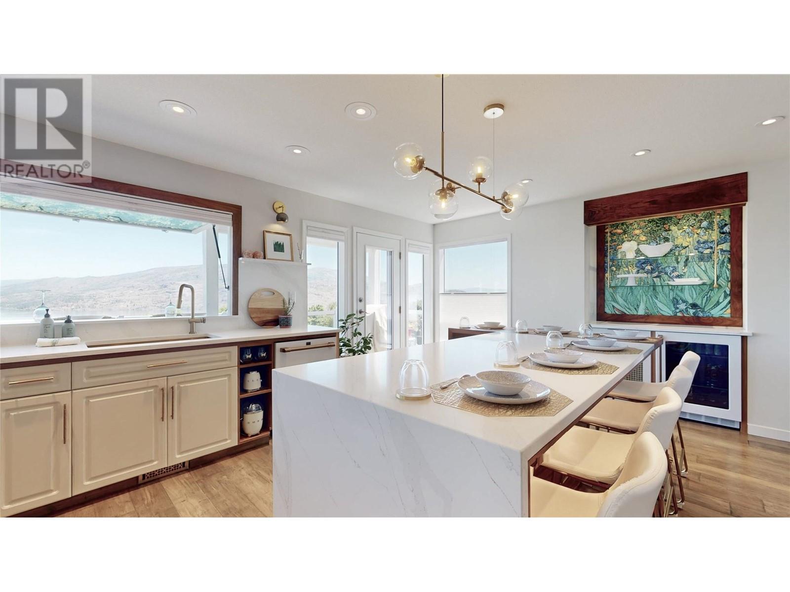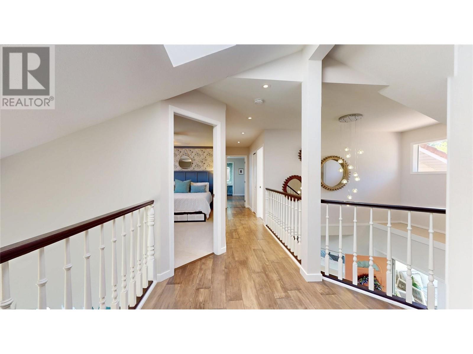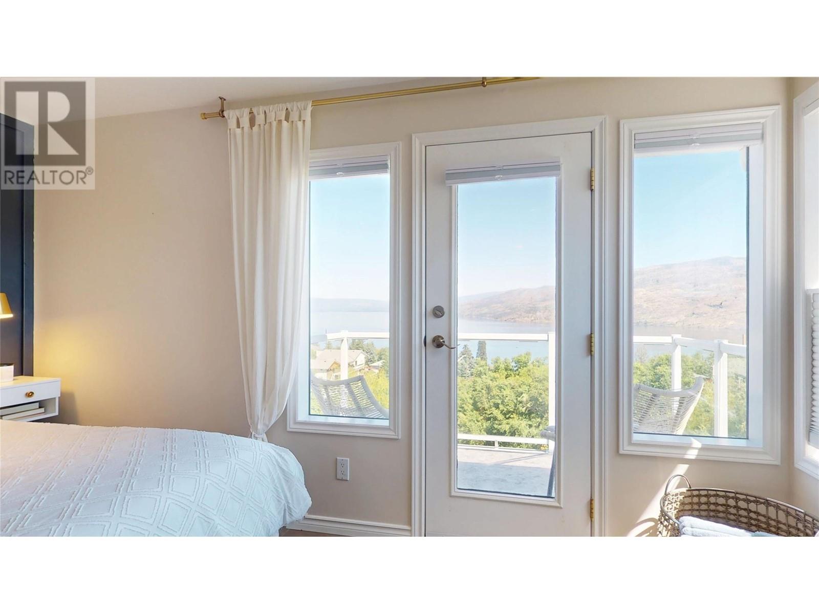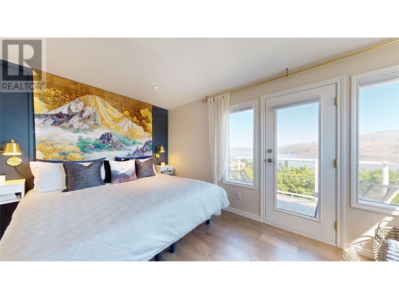 The moment you walk through the front door you are greeted with expansive sight lines to the lake across the entire width of the main floor. Huge vaulted ceilings to your left to the upstairs and very tall great room windows open up the lake and valley views to raise your spirits. To your right is a large designer island kitchen that opens up a world of possibilities for entertaining. Enjoy 6 burner gas stove with Euro style hood vent, a coffee & wine bar, open shelving, window trim & island in custom black walnut. The large picture window opens all the way for access to the kitchen bar on sundeck. Enjoy the outdoor quartzite eating bar. The upper level boasts a large primary bedroom with terrific views looking across and south to Penticton. A 5-piece ensuite with large soaker and walk in shower plus walk-in closet compliment the primary bedroom. The lower level offers a large family room/rec room with access to a massive stamped concrete deck with lovely lake and garden views. Enjoy double garage with room to turn around at the bottom, plus extra parking along the road. Ellison Ave is a school bus route which gets plowed first in the winter. There is a bus stop just up the street at Ellison & Princeton Road. New lighting throughout, top down bottom up blinds for maximum view and privacy, French bistro brass & glass shelving. New hot water tank. Furnace 2015, AC Compressor 2022 and newer appliances. Clay tile roof! Just move in! (id:2469)