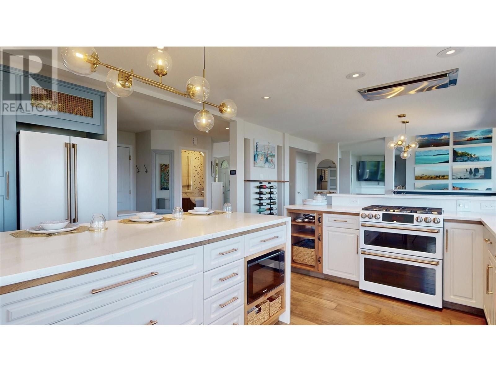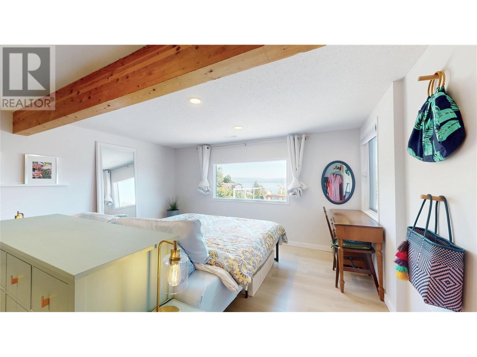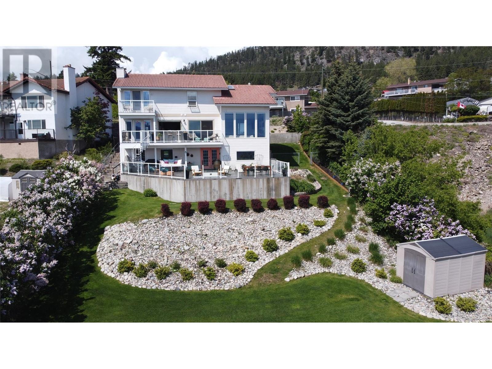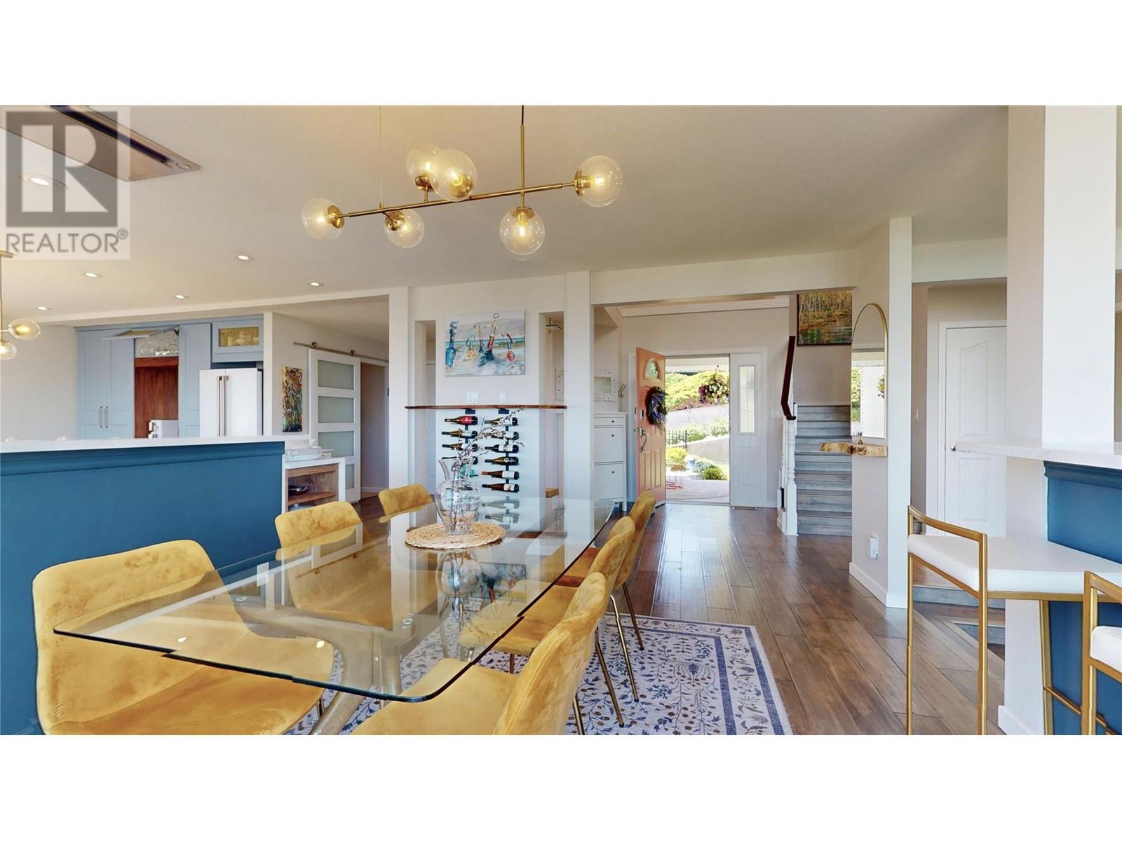 The moment you walk through the front door you are greeted with expansive sight lines to the lake across the entire width of the main floor. Huge vaulted ceilings to your left to the upstairs and very tall great room windows open up the lake and valley views to raise your spirits. To your right is a large designer island kitchen that opens up a world of possibilities for entertaining. Enjoy 6 burner gas stove with Euro style hood vent, a coffee & wine bar, open shelving, window trim & island in custom black walnut. The large picture window opens all the way for access to the kitchen bar on sundeck. Enjoy the outdoor quartzite eating bar. The upper level boasts a large primary bedroom with terrific views looking across and south to Penticton. A 5-piece ensuite with large soaker and walk in shower plus walk-in closet compliment the primary bedroom. The lower level offers a large family room/rec room with access to a massive stamped concrete deck with lovely lake and garden views. Enjoy double garage with room to turn around at the bottom, plus extra parking along the road. Ellison Ave is a school bus route which gets plowed first in the winter. There is a bus stop just up the street at Ellison & Princeton Road. New lighting throughout, top down bottom up blinds for maximum view and privacy, French bistro brass & glass shelving. New hot water tank. Furnace 2015, AC Compressor 2022 and newer appliances. Clay tile roof! Just move in! (id:2469)