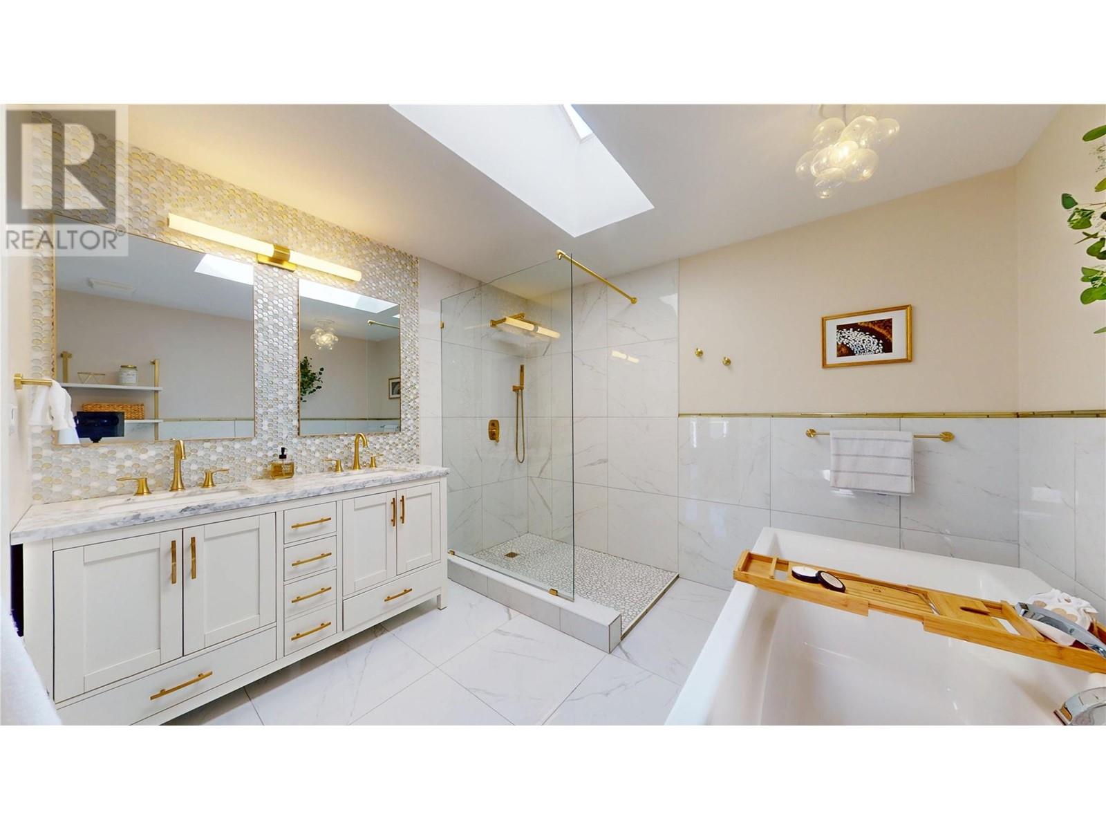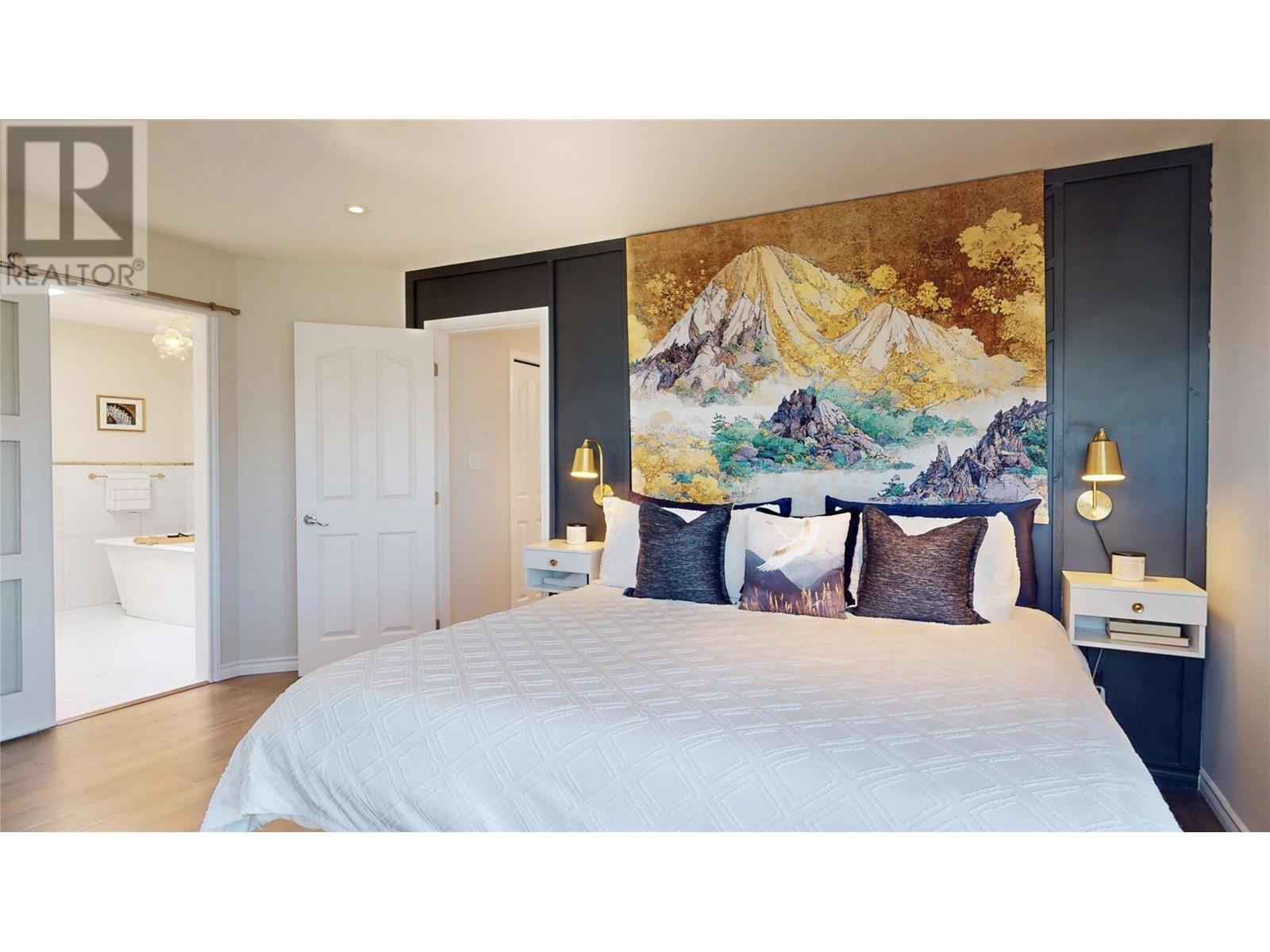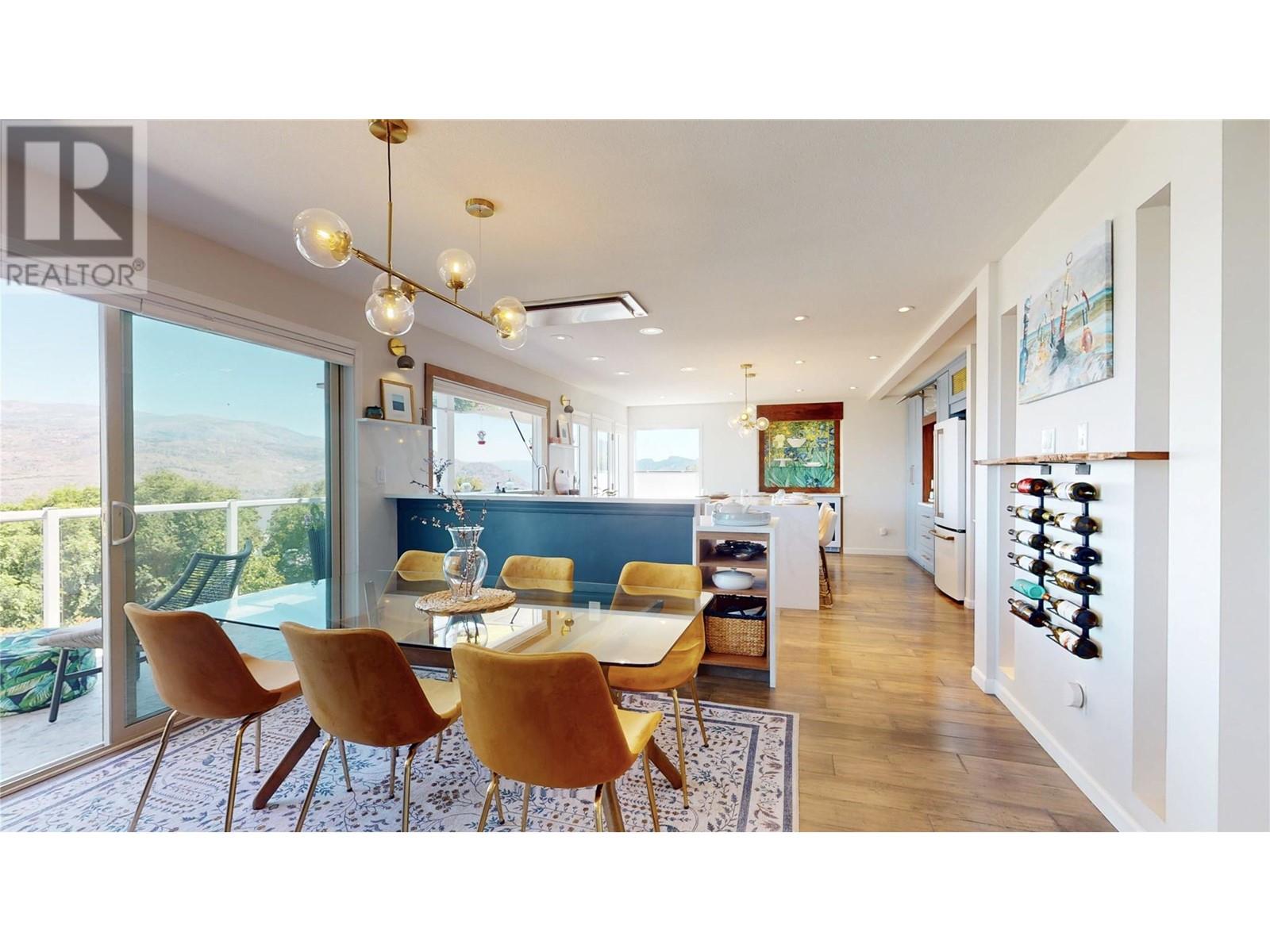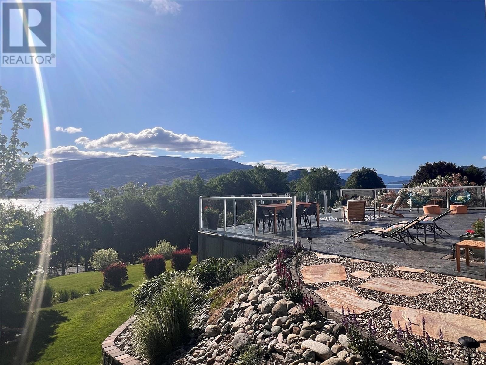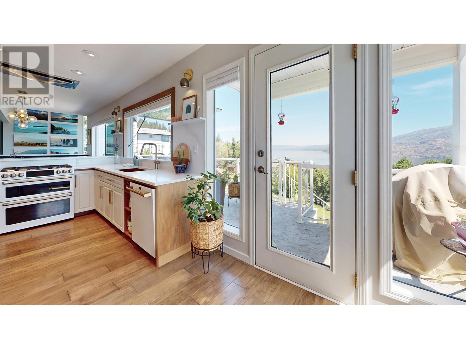 The moment you walk through the front door you are greeted with expansive sight lines to the lake across the entire width of the main floor. Huge vaulted ceilings to your left to the upstairs and very tall great room windows open up the lake and valley views to raise your spirits. To your right is a large designer island kitchen that opens up a world of possibilities for entertaining. Enjoy 6 burner gas stove with Euro style hood vent, a coffee & wine bar, open shelving, window trim & island in custom black walnut. The large picture window opens all the way for access to the kitchen bar on sundeck. Enjoy the outdoor quartzite eating bar. The upper level boasts a large primary bedroom with terrific views looking across and south to Penticton. A 5-piece ensuite with large soaker and walk in shower plus walk-in closet compliment the primary bedroom. The lower level offers a large family room/rec room with access to a massive stamped concrete deck with lovely lake and garden views. Enjoy double garage with room to turn around at the bottom, plus extra parking along the road. Ellison Ave is a school bus route which gets plowed first in the winter. There is a bus stop just up the street at Ellison & Princeton Road. New lighting throughout, top down bottom up blinds for maximum view and privacy, French bistro brass & glass shelving. New hot water tank. Furnace 2015, AC Compressor 2022 and newer appliances. Clay tile roof! Just move in! (id:2469)