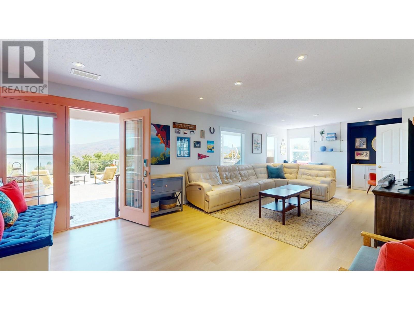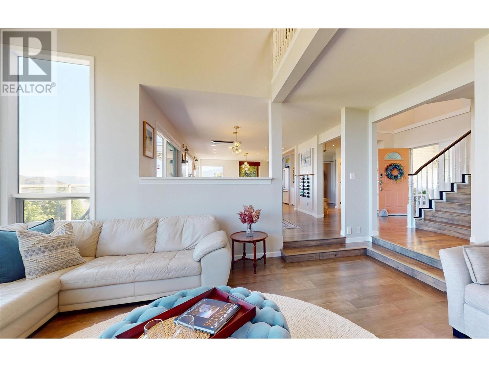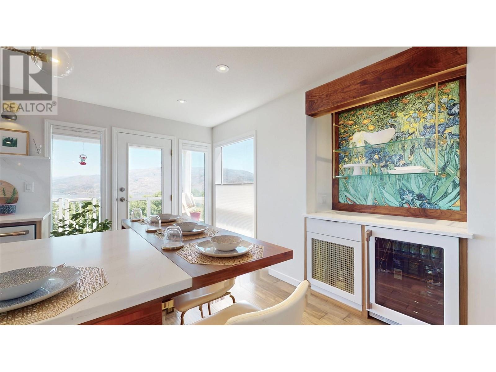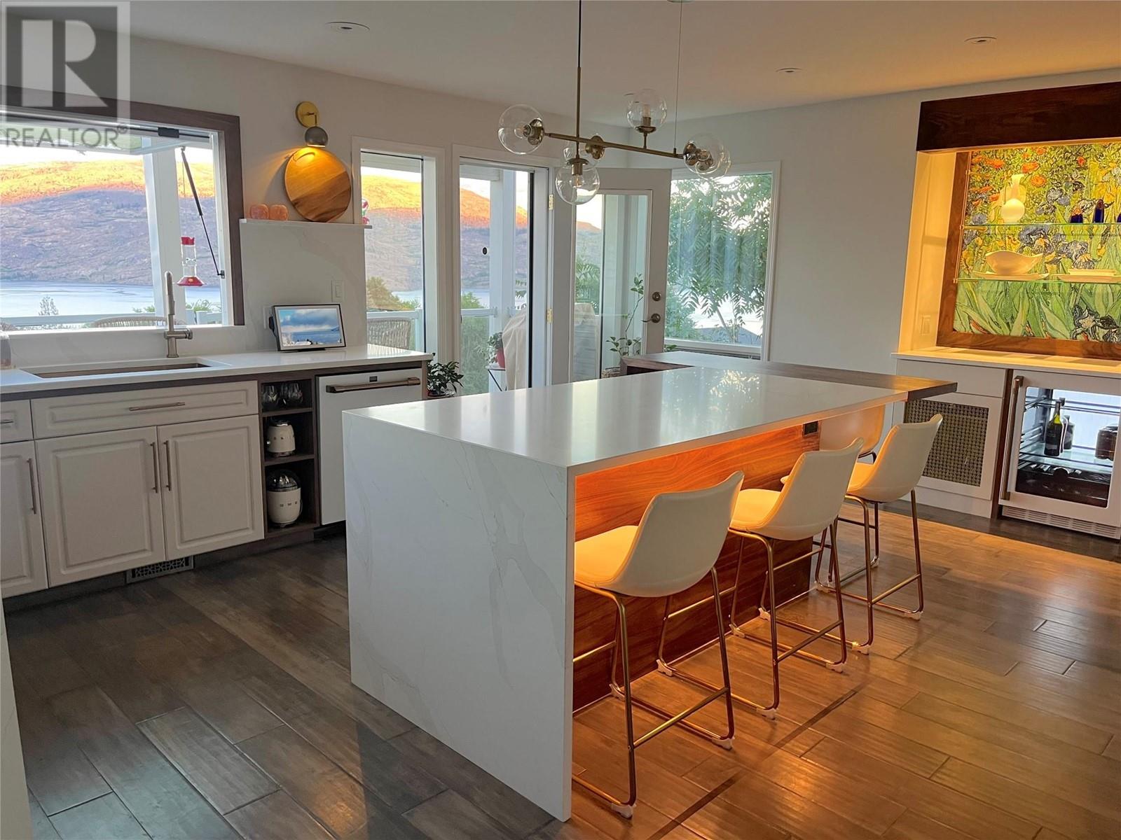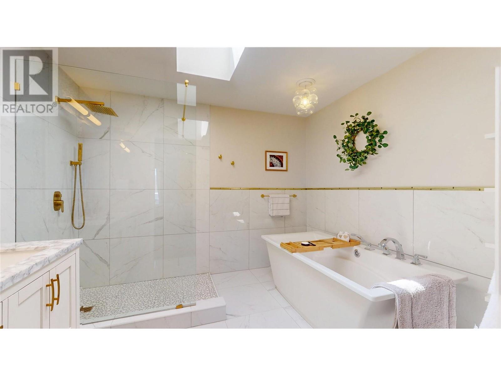 The moment you walk through the front door you are greeted with expansive sight lines to the lake across the entire width of the main floor. Huge vaulted ceilings to your left to the upstairs and very tall great room windows open up the lake and valley views to raise your spirits. To your right is a large designer island kitchen that opens up a world of possibilities for entertaining. Enjoy 6 burner gas stove with Euro style hood vent, a coffee & wine bar, open shelving, window trim & island in custom black walnut. The large picture window opens all the way for access to the kitchen bar on sundeck. Enjoy the outdoor quartzite eating bar. The upper level boasts a large primary bedroom with terrific views looking across and south to Penticton. A 5-piece ensuite with large soaker and walk in shower plus walk-in closet compliment the primary bedroom. The lower level offers a large family room/rec room with access to a massive stamped concrete deck with lovely lake and garden views. Enjoy double garage with room to turn around at the bottom, plus extra parking along the road. Ellison Ave is a school bus route which gets plowed first in the winter. There is a bus stop just up the street at Ellison & Princeton Road. New lighting throughout, top down bottom up blinds for maximum view and privacy, French bistro brass & glass shelving. New hot water tank. Furnace 2015, AC Compressor 2022 and newer appliances. Clay tile roof! Just move in! (id:2469)