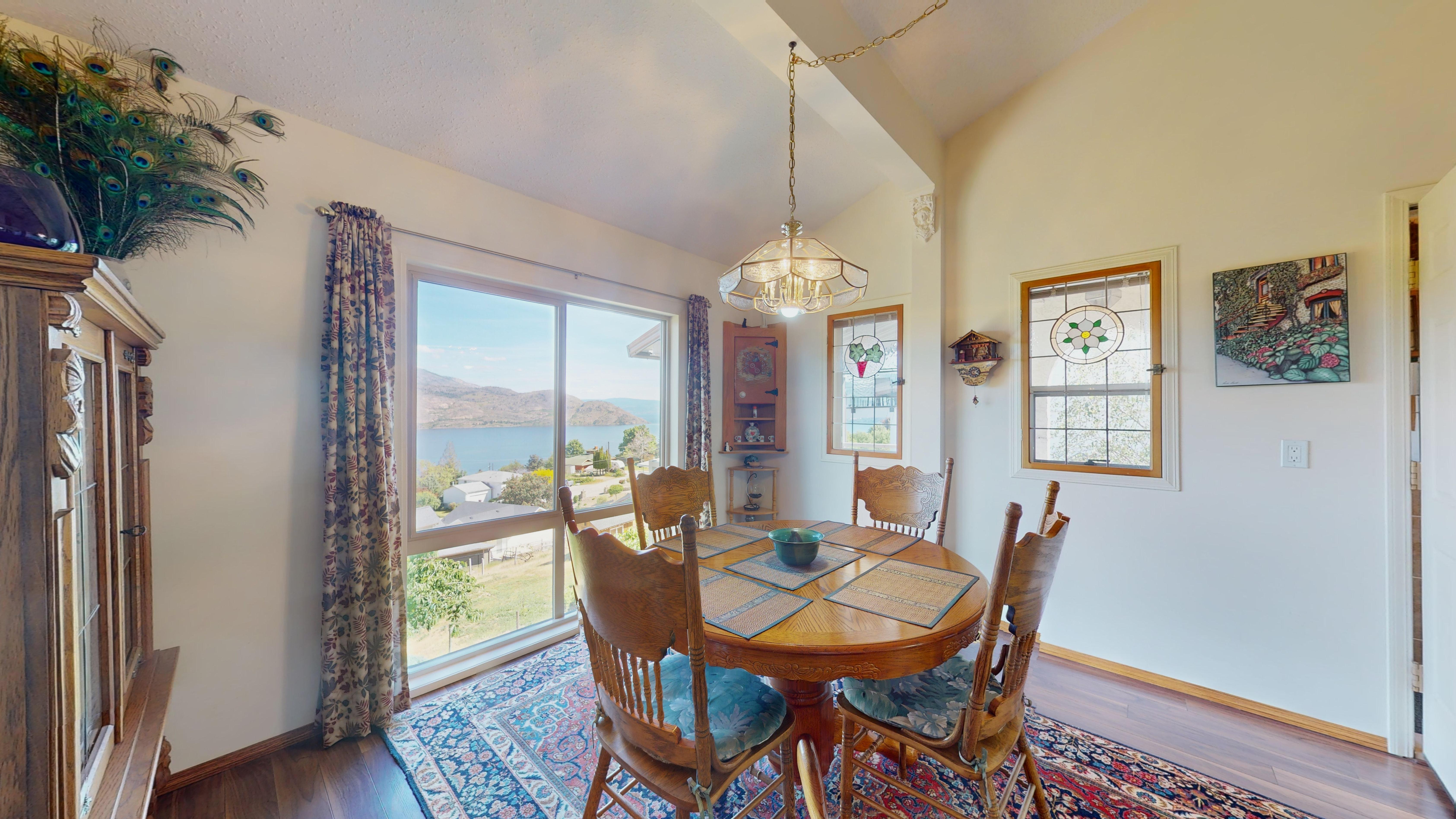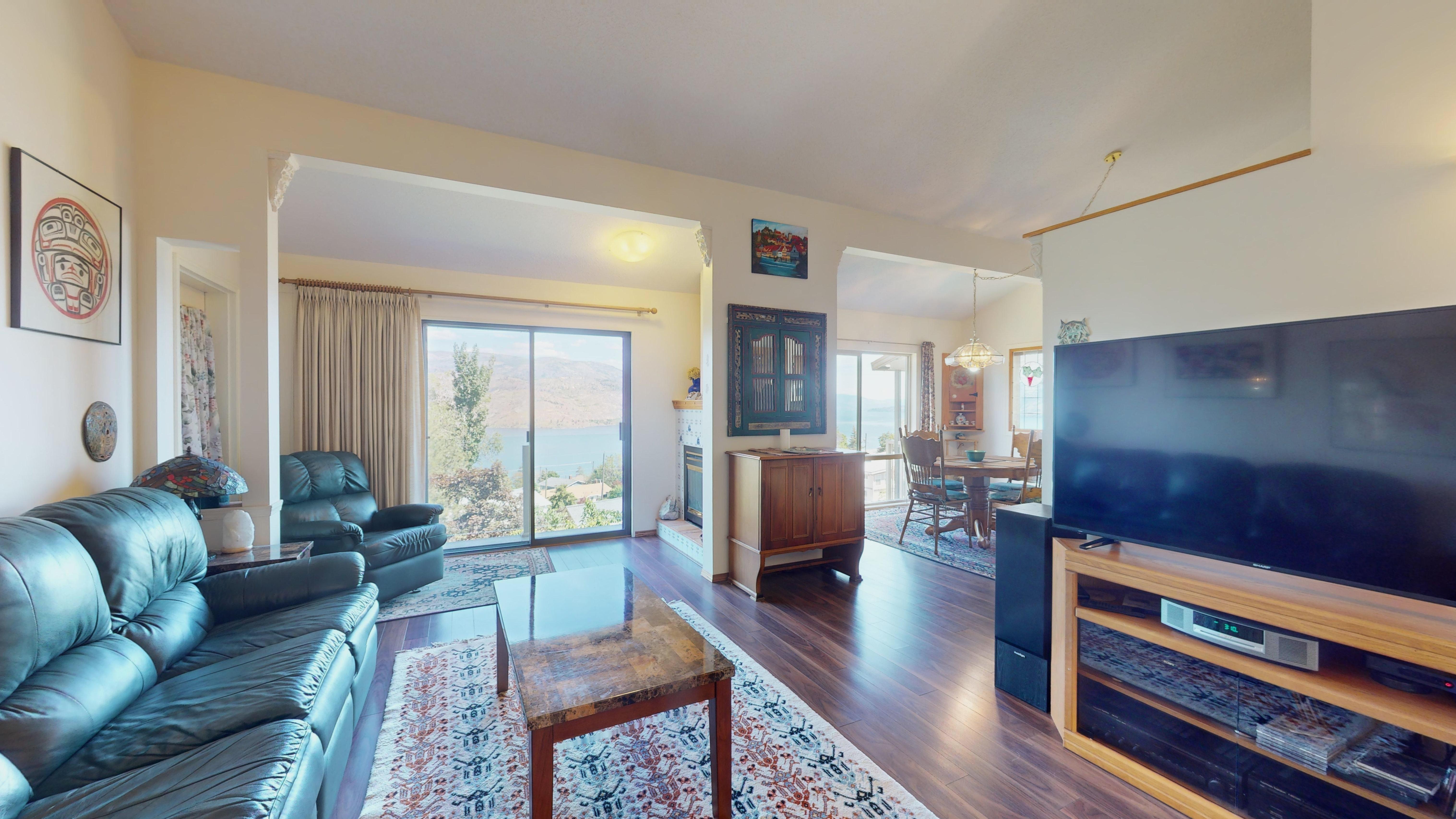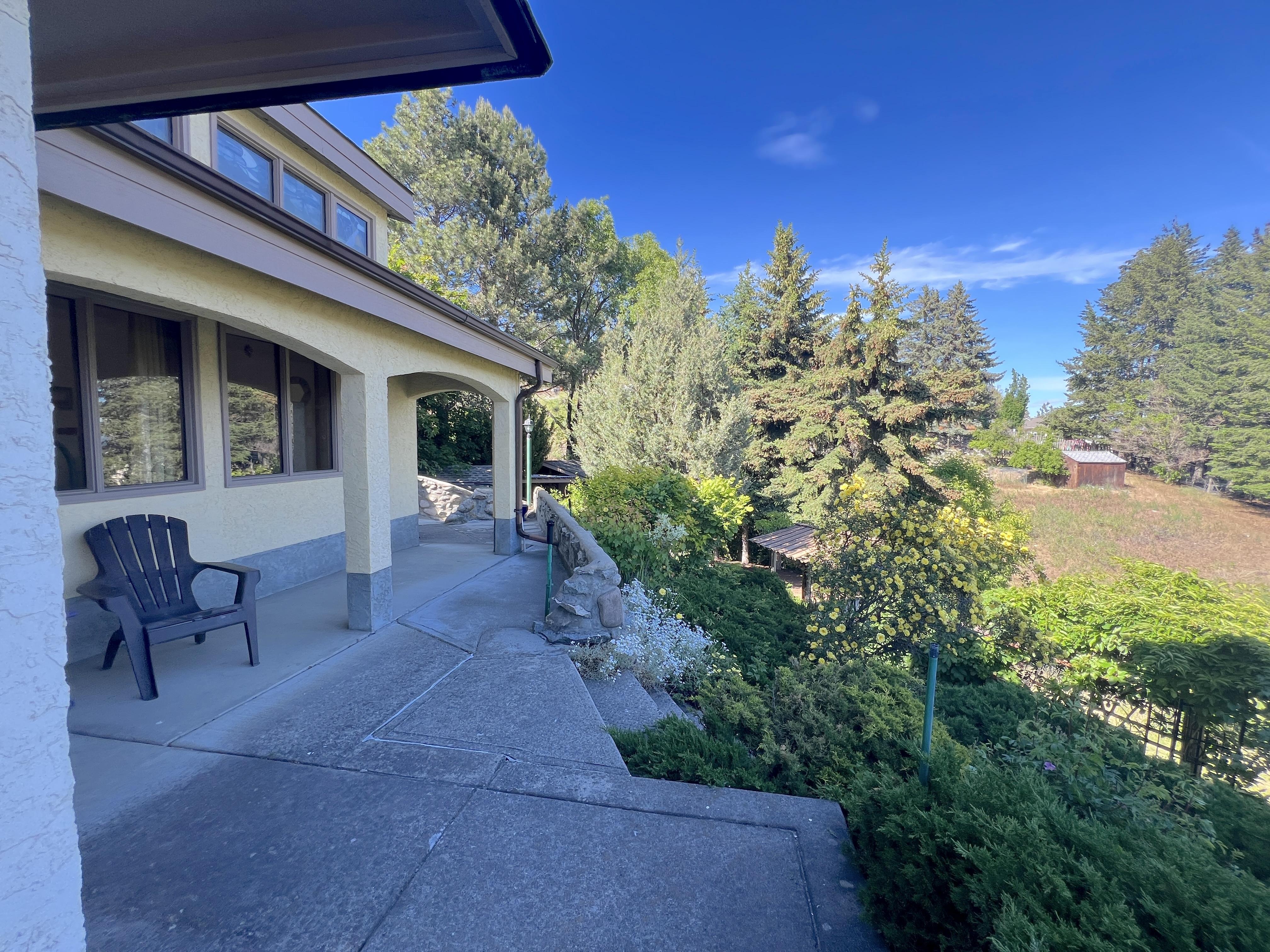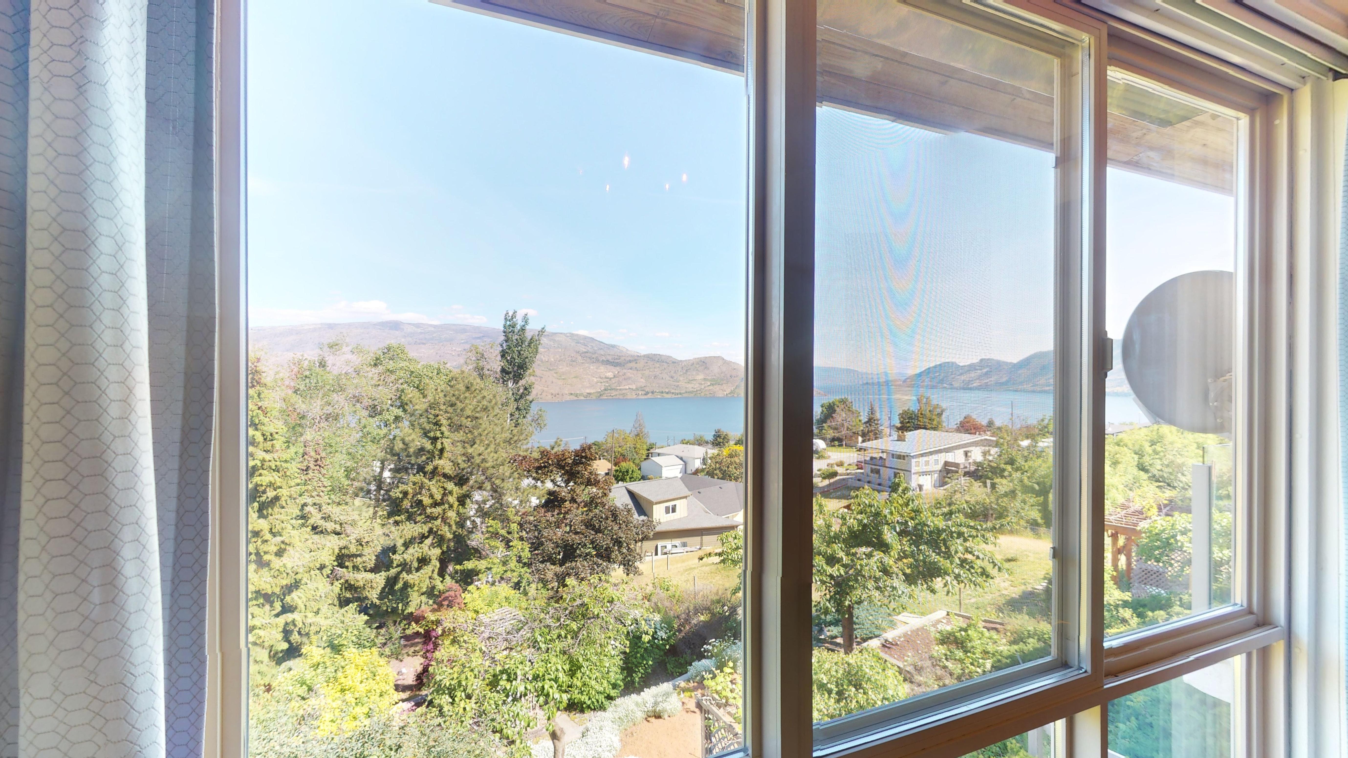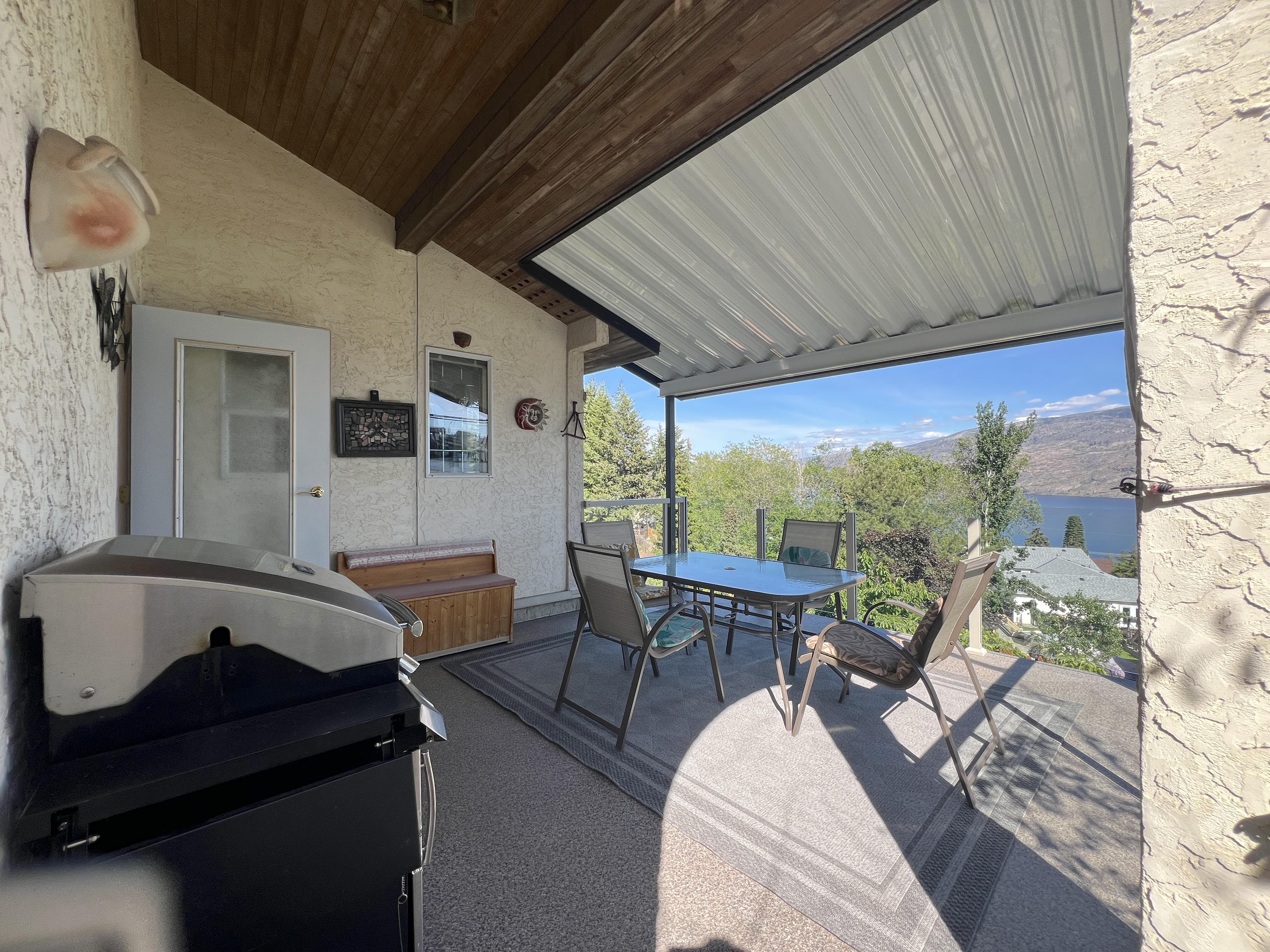 Great lake views looking south towards Penticton. No step rancher walk out with vaulted ceilings, beams and archways & stained glass accents. Well cared for home with pride of ownership and updates over the years, recently new hotwater tank and new air conditioning. There is a private lower side yard gathering area plus the backyard is fully terraced and landscaped with fruit trees and gardens. Closed in court yard at the front of the house for privacy and parking for RV or boat. Parking out front along the road as well. Great neighbourhood on school bus route so plowed first in the winter. That rare combination of a flat driveway with lakeviews!